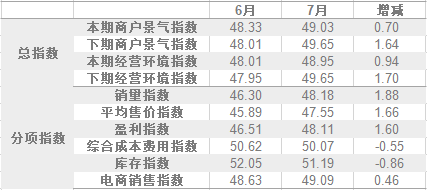 從商戶景氣指數來看,總指數中,7月商戶景氣指數為49.03,比6月的48.33上升0.70個百分點;經營環境指數為48.95,比6月的48.01上升0.94個百分點。