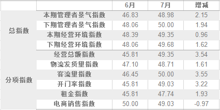 分項指數中,經營總額指數為49.35,比6月的45.81上升3.54個百分點;物流發貨量指數為48.71,比6月的47.10上升1.61個百分點;客流量指數為50.00,比6月的46.45上升3.55個百分點;開門率指數為49.03,比6月的45.81上升3.22個百分點;租金指數為47.74,比6月的45.81上升1.93個百分點;電商銷售指數為49.03,比6月的50.00下降0.97個百分點。